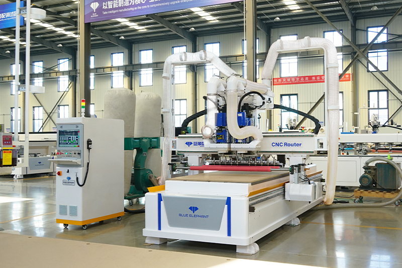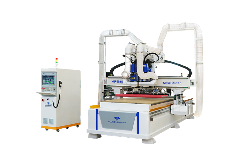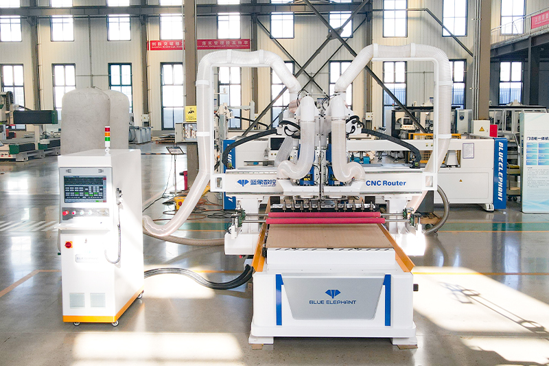 2.共兩套的9KW大功率主軸配備12位直排刀庫(每個主軸可配6把刀),高速開料,刀庫合理分配,互不干擾;