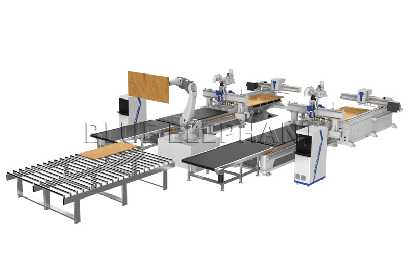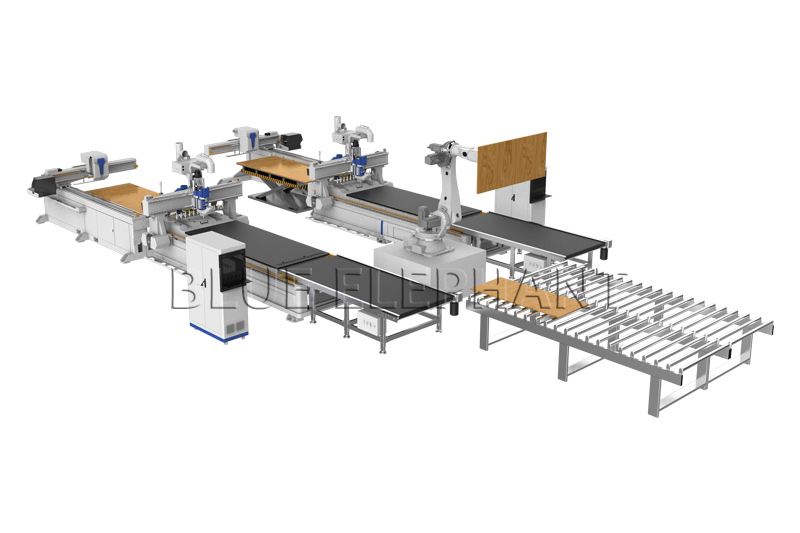 叉車送料至升降機(jī)---貼標(biāo)機(jī)抓取板料自動(dòng)貼標(biāo)---開(kāi)料機(jī)鉆孔、開(kāi)槽、開(kāi)料---機(jī)器人抓料送至平移動(dòng)力輸送輥臺(tái)---進(jìn)入緩存?zhèn)},一次排隊(duì)等待運(yùn)送至封邊單元